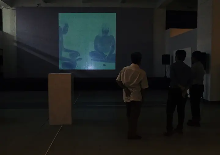 The work is a video featuring a man, a woman, and an egg. The man takes plastic bags, puts them in his mouth, chews them, and spits them out. The woman uses the plastic bags the man spits out to tie the egg. The video repeats this action until the man can no longer chew them.